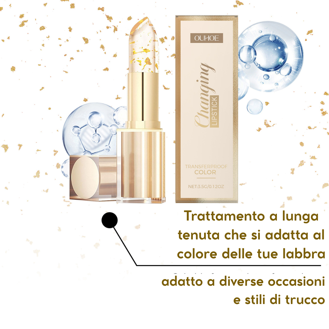 . Si adatta alla temperatura delle tue labbra, rivelando un colore unico. Arricchito con foglia d'oro per esaltare la texture delle tue labbra.